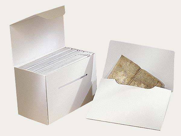 Archivní krabice pro vzpřímené skladování rozšiřovacích složek, skleněných desek, sbírek s volnými a nevázanými materiály, brožur a časopisů. Hladký vnitřní povrch. Po dohodě možno dodat s otvorem pro úchyt, svislými podporami a chlopní na přední straně.