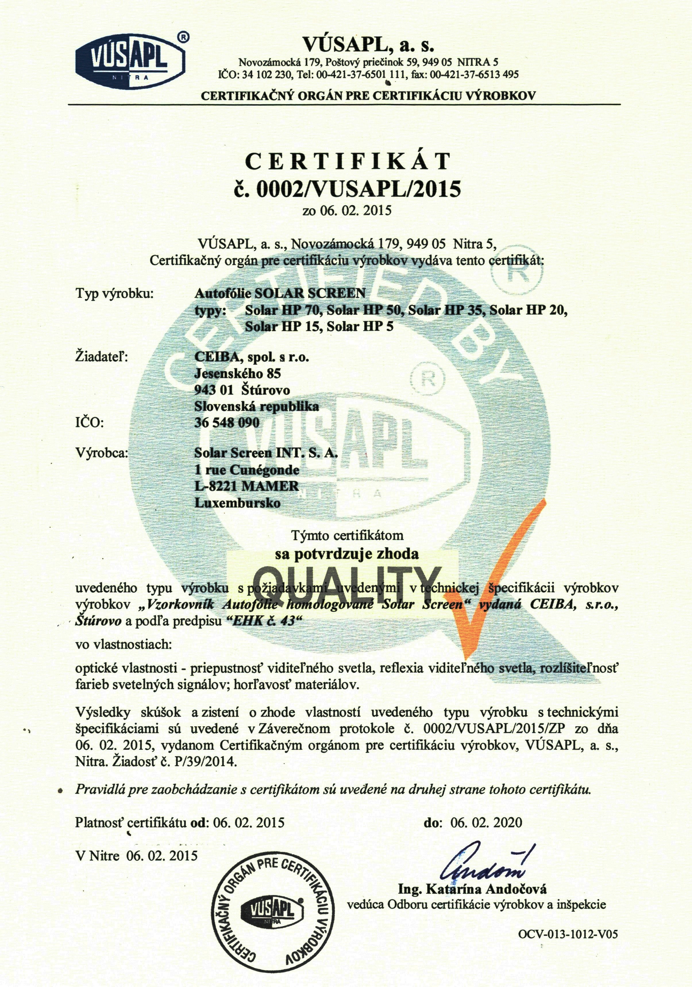 a potvrdenie, že aplikované fólie značky SolarScreen, typ Solar HP majú udelené typové schválenie vydané MDPaT SR.