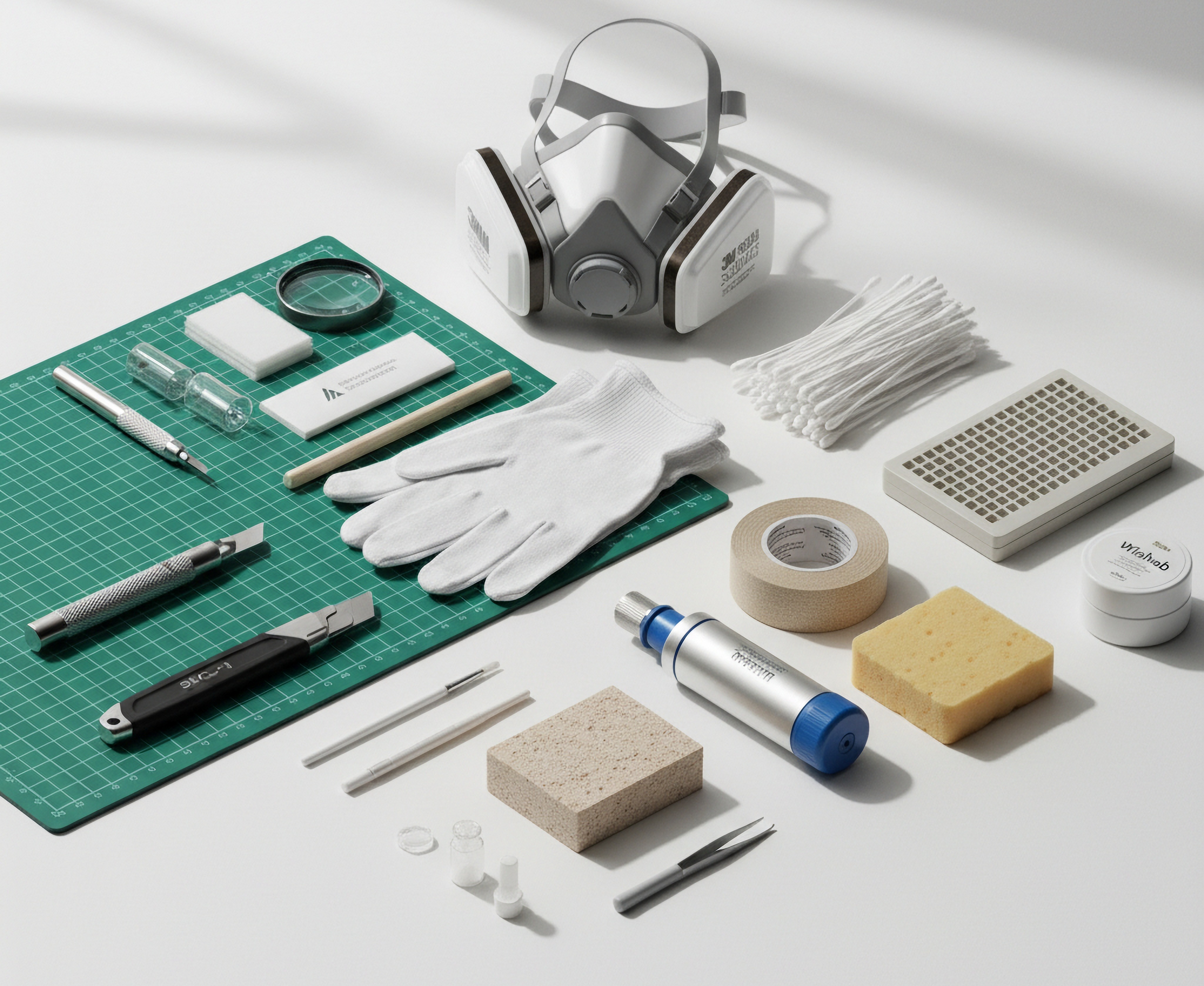 Spotřební materiál a nástroje pro čištění, ošetřování, restaurování a archivaci foto-dokumentů (sada intertních textilních rukavic, bavlněných nechlorovaných čistících a dezinfekčních tampónů na fotografie, kazeta na odvlhčování, restaurátorská páska, odprašovací štětec, wishab čistící houba a prášek, 3M 9928 O3 respirátor pro dezinfekci archiválií, řezací nůž SAC-1, řezací podložka a další příslušenství)