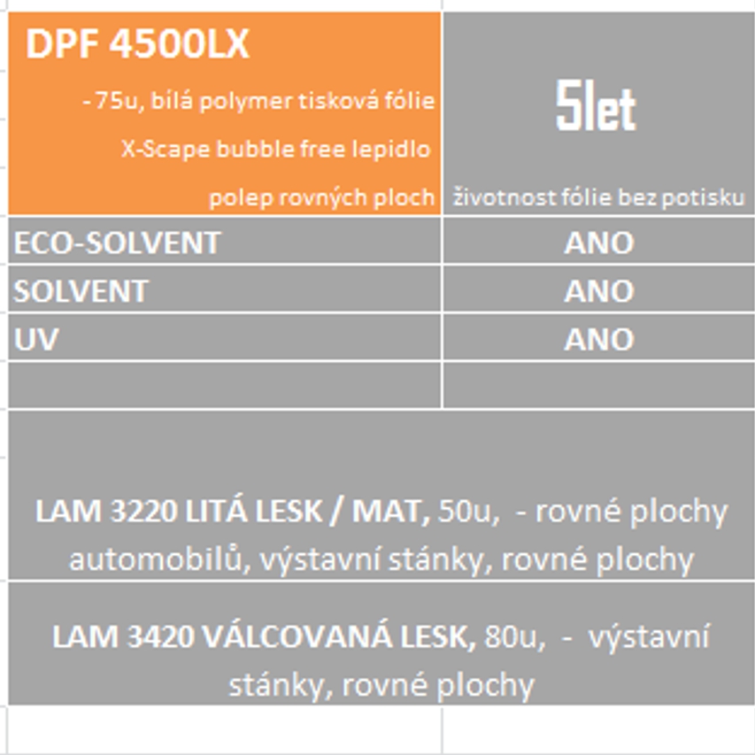 DPF 4500LX je střednědobá polymerická vinylová fólie s jasnějším bílým leskem pro živější barvy výtisků o tloušťce 75 mikronů. Tato fólie je ideální pro aplikace na rovné plochy automobilů, deskové materiály, skla a POP displeje. DPF 4500LX má permanentní lepdilo s šedým odstínem pro lepší překrytí podkladového materiálu s technologií X-Scape. Tato technologie umožňuje snadnější aplikaci pomocí kanálkového lepidla. Pro snadnější aplikaci na automobily je doporučeno použití lité