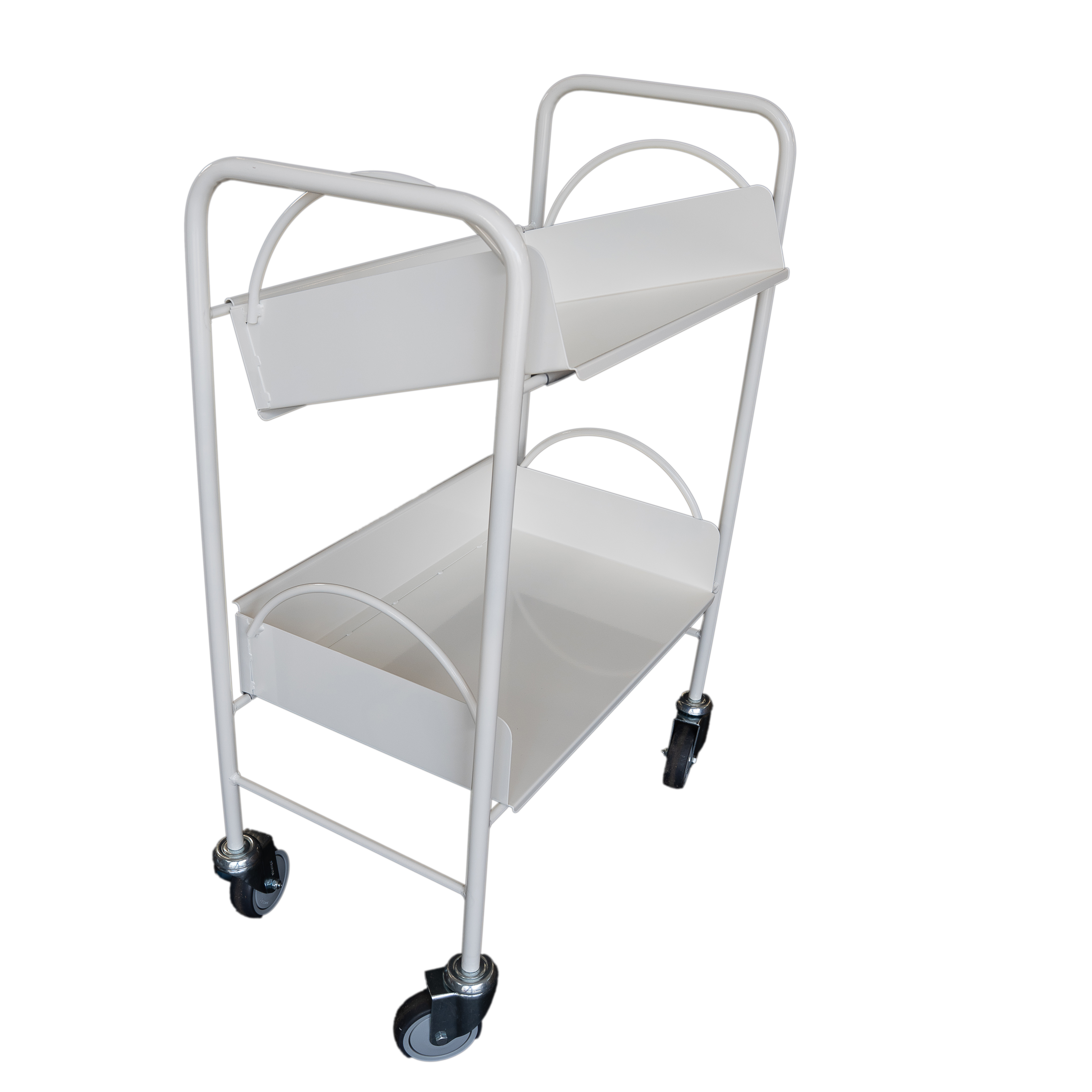 Celokovový vozík se dvěma volně loženými košíky, které lze z vozíku sejmout a použít na odkládání knih.