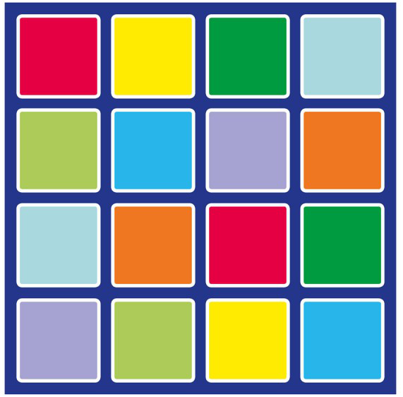 Krásné velké barevné koberce, ideální doplněk interiéru knihoven nebo jako podlahový prostor pro čtení knih nebo hraní her a posezení dětí při různých akcích. V nabídce jsou varianty čtvercového koberce s 16 barevnými čtverci nebo obdélníkový s 24 čtverci. Koberce jsou v zářivých barvách v dětském designu. Koberec je odolný proti mačkání díky unikátní Rhombus ™ protiskluzové podložce bezpečnostní Dura-Latex ™, koberec je odolný proti oděru a má pevně vázané hrany, aby nedošlo k jejich třepení. Jemná povrchová úprava Nylon Twist. Koberec splňuje všechny příslušné bezpečnostní normy.