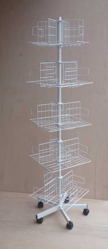 Otočný drátěný stojan na knihy. 5 otočných pater se zarážkami na uložení knih.