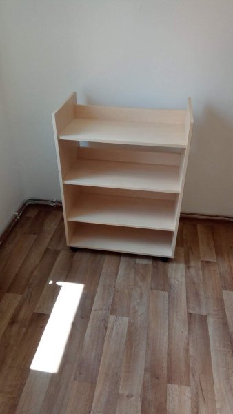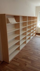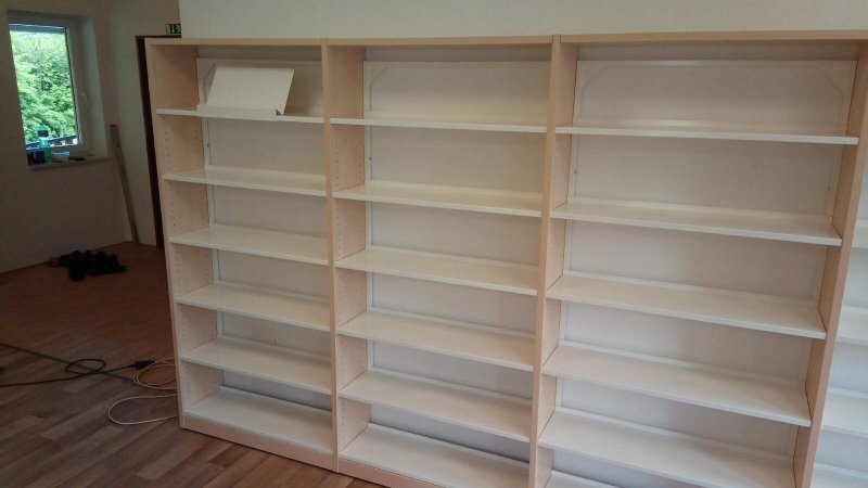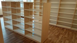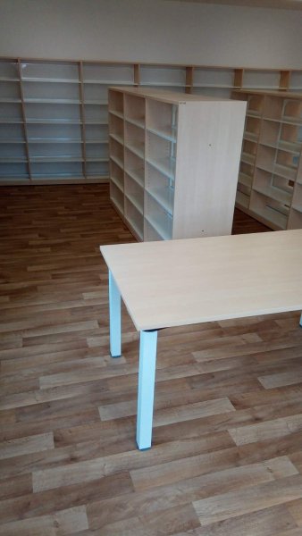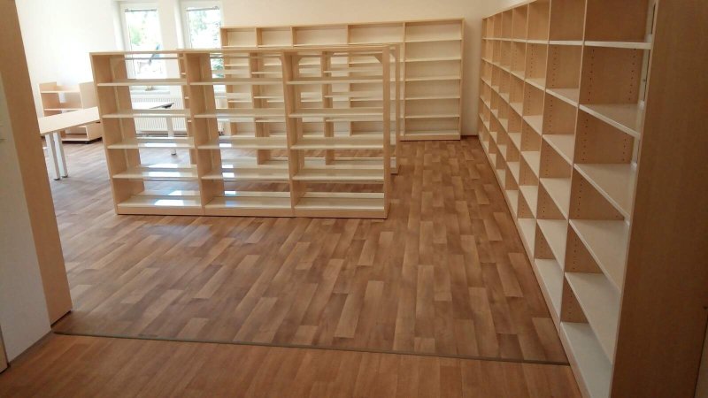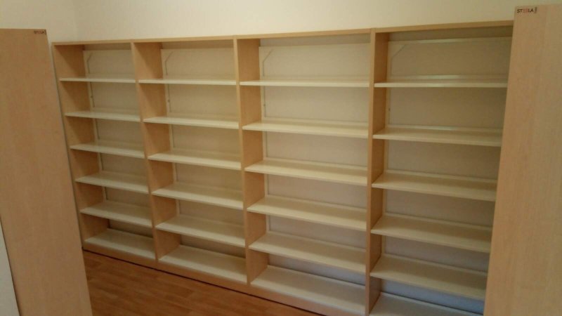 Vybavení knihovny novými regály řady STEELA, PC stoly a stoly se skládacími nohami.