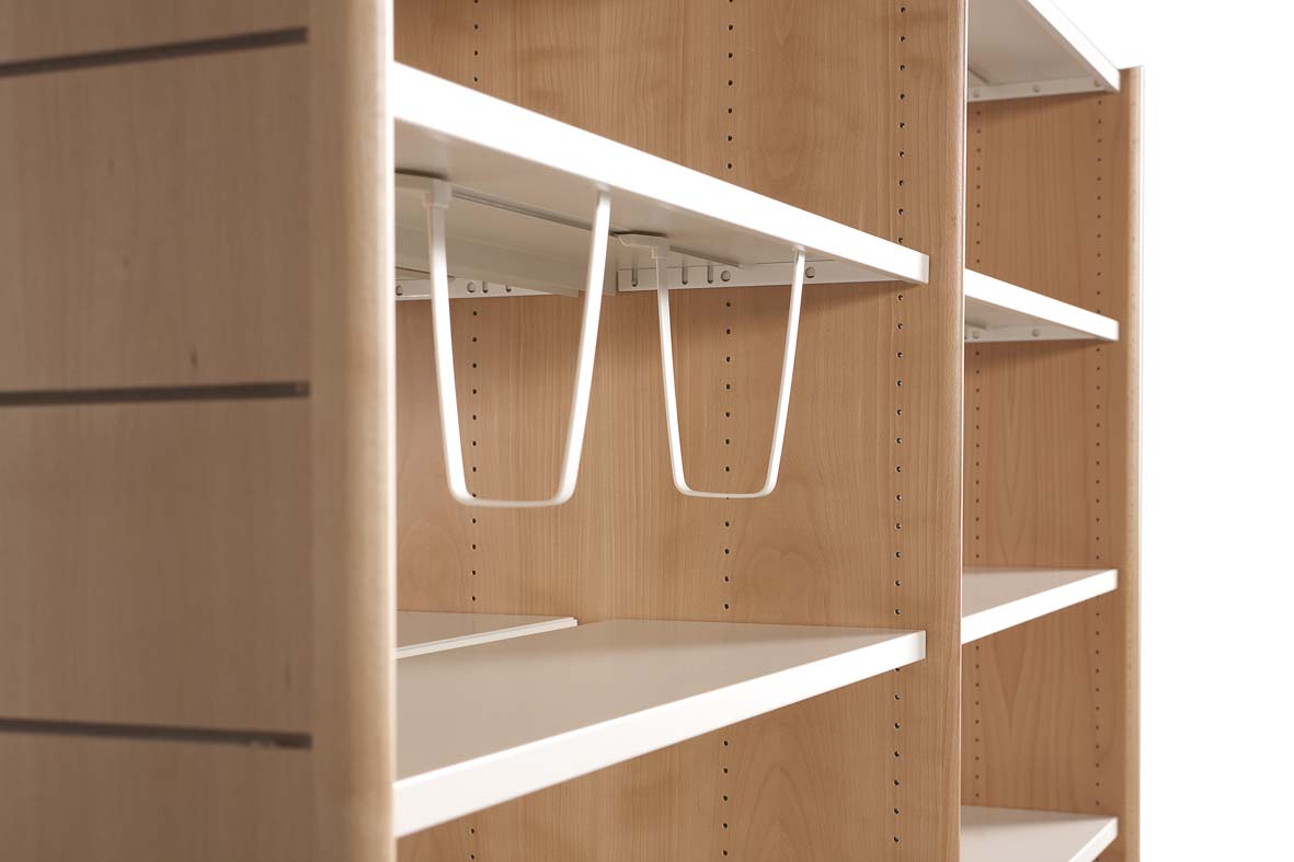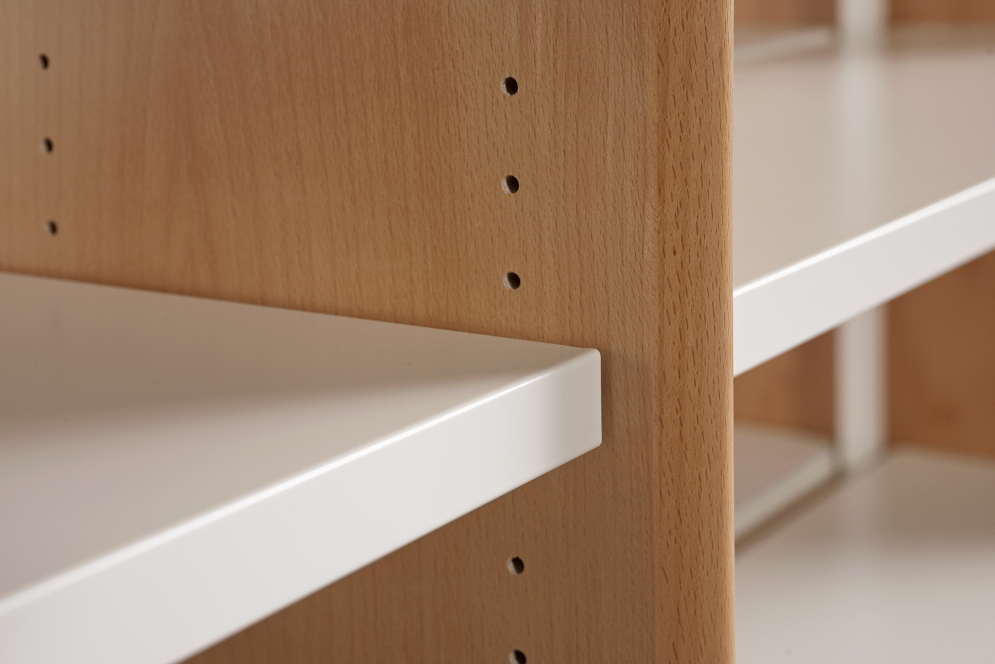 Vertikální boční panely mají na jené straně nebo na obou stranách řadu otvorů o průměru 5 mm pro vsunutí policových podpěr. Otvory umožňují umístit police v libovolné pozici po 25 mm. Bočnice jsou ve spodní části vybaveny dvěma otvory pro nastavitelné nohy, které nastaví výšku regálů o dalších 10 mm.