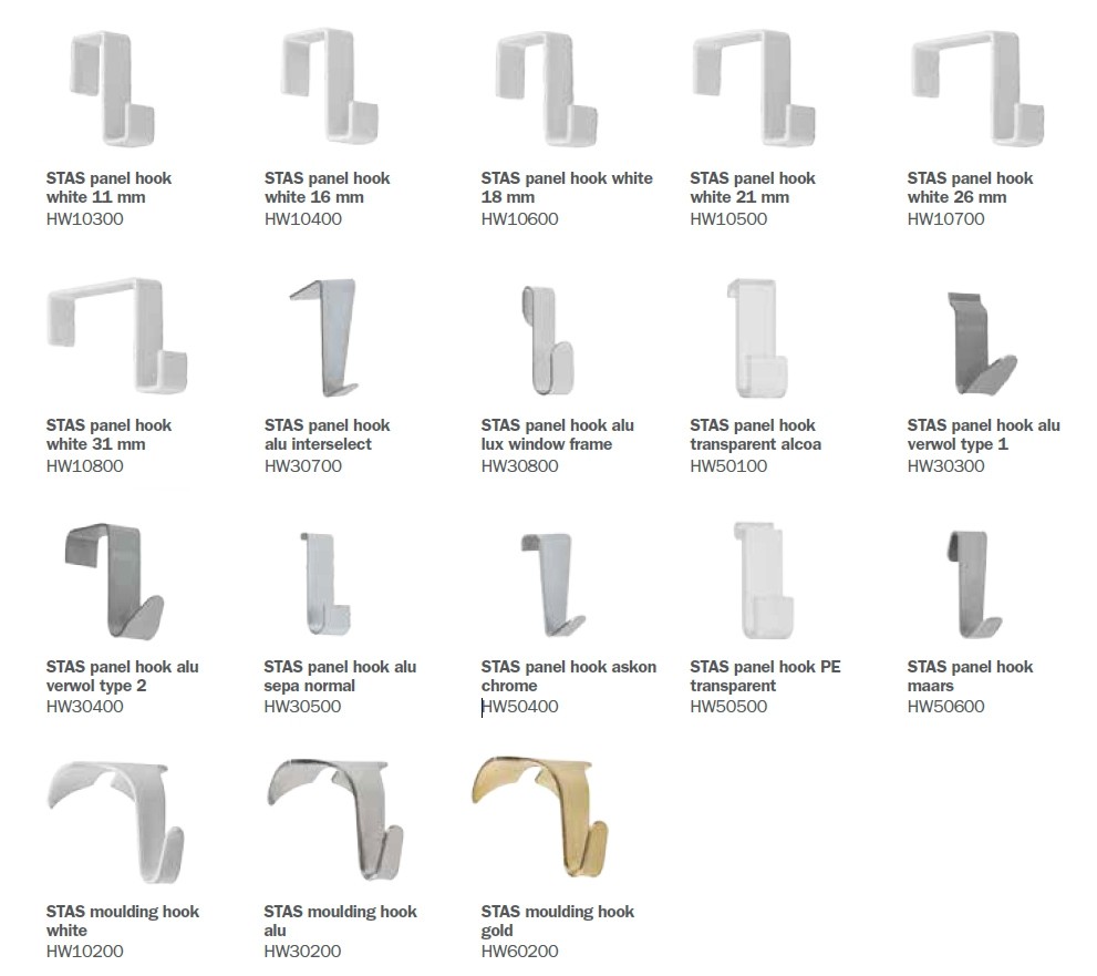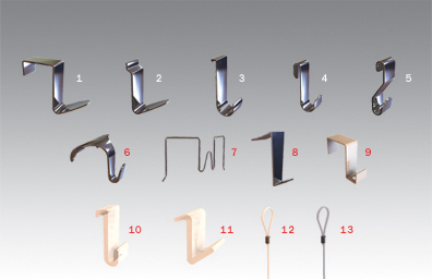 Široká nabídka universálních výstavních háčků a háků pro použití na výstavní panely. Ideální kombinace s nylonovými nebo ocelovými lanky s okem a háčky Zipper nebo Smart.