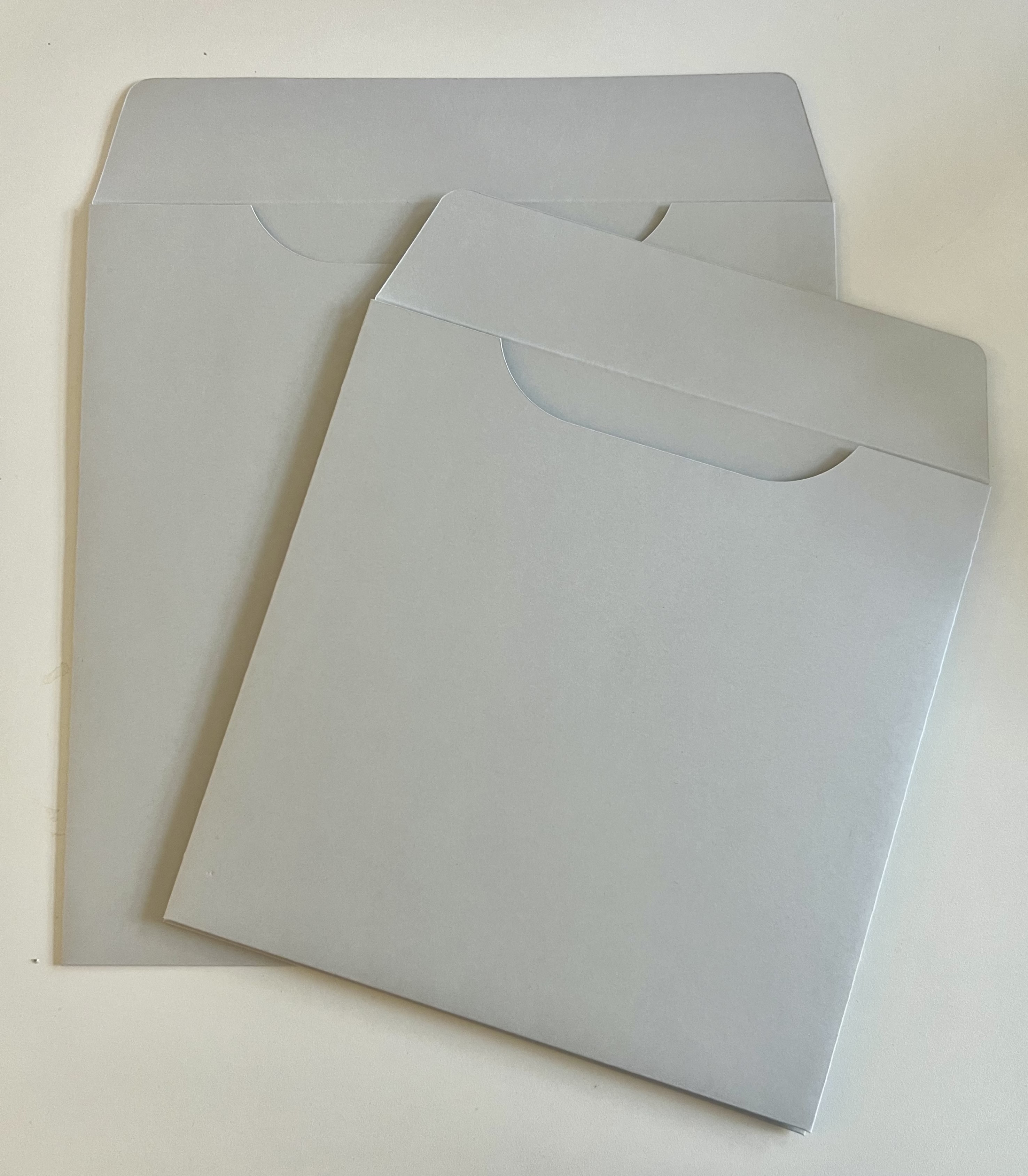Archivní obaly ve tvaru U – na vinylové a šelakové desky, vyrobené z archivního kartonu 047 šedomodré barvy, 330 g/m², cca. tloušťka 0,35 mm.