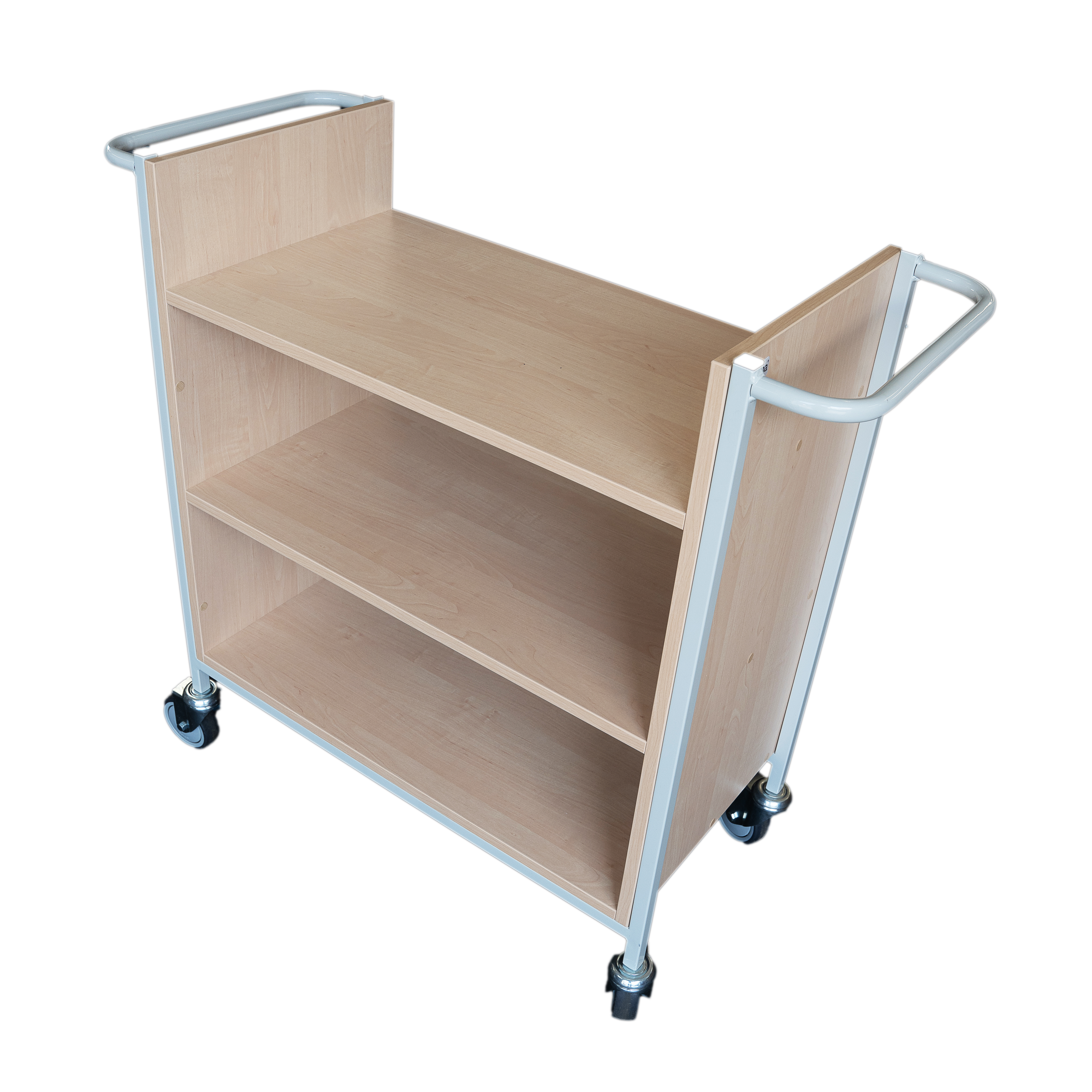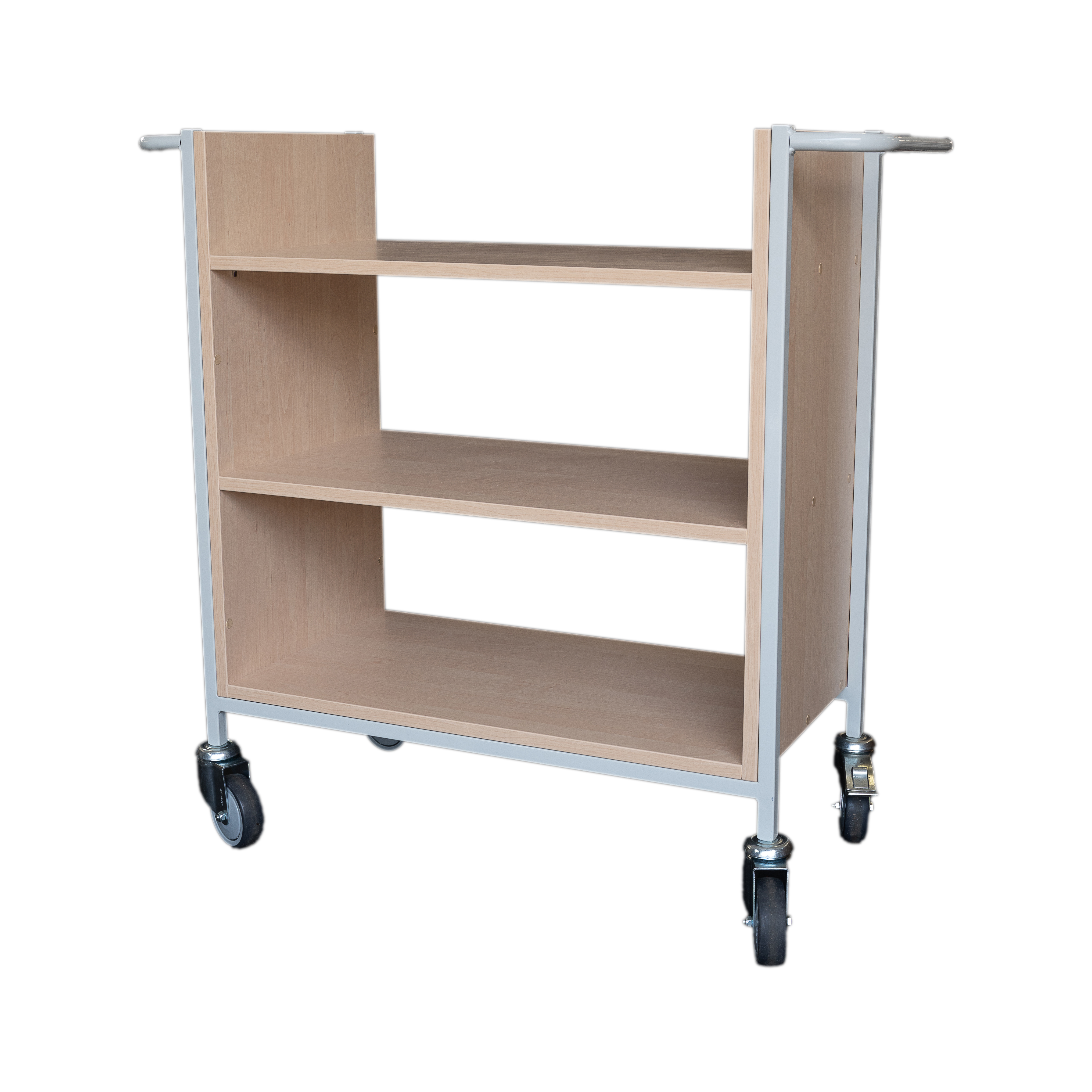 Robustní vozík s kovovou konstrukcí a dřevěnými policemi pro ukládání převážených knih, 4 velmi odolná otočná kolečka (průměr koleček 10 mm, 3 + 1 kolečko s brzdou), provedení buk/červený rám, nyní nově i v provedení bříza/bílý rám. Za příplatek barva na přání.