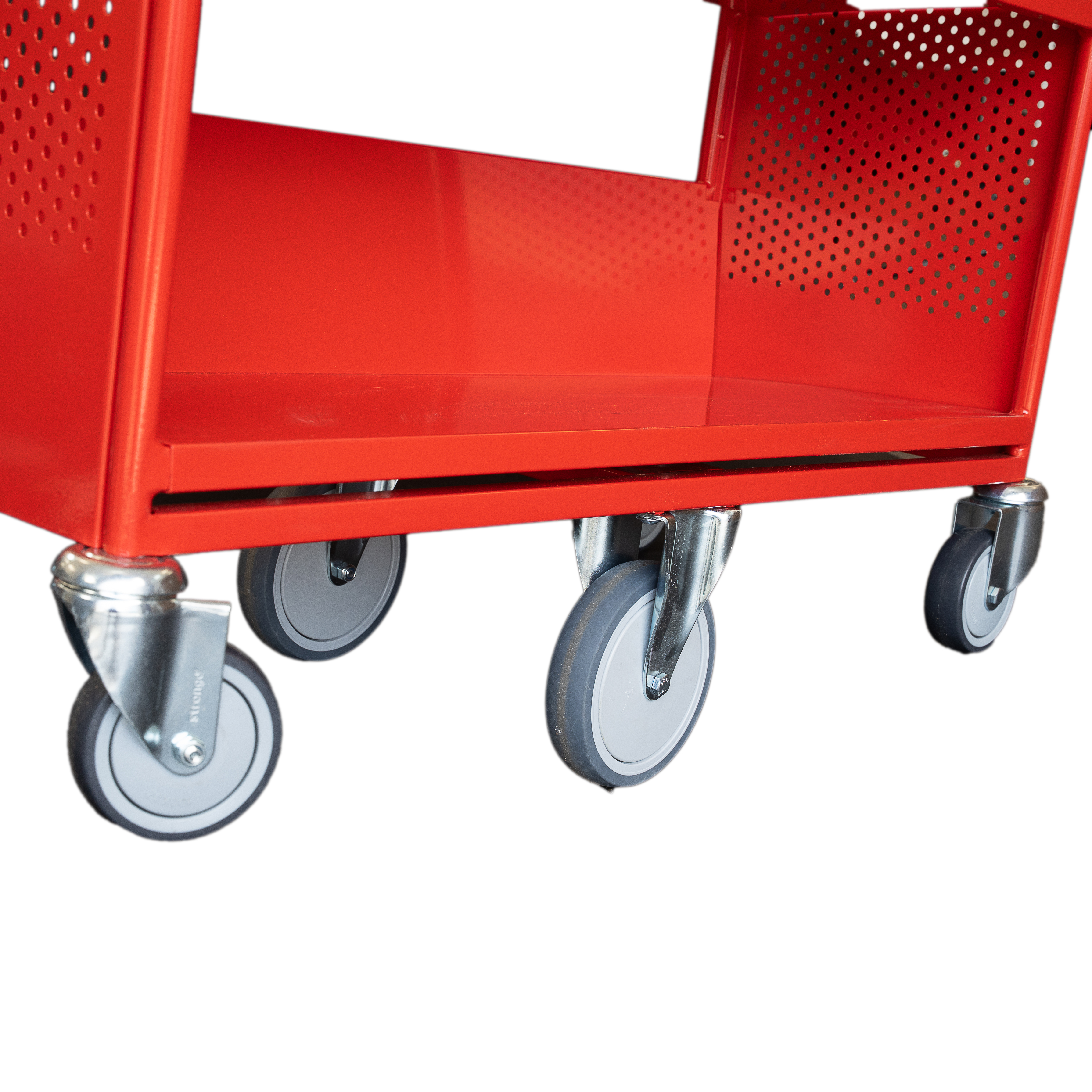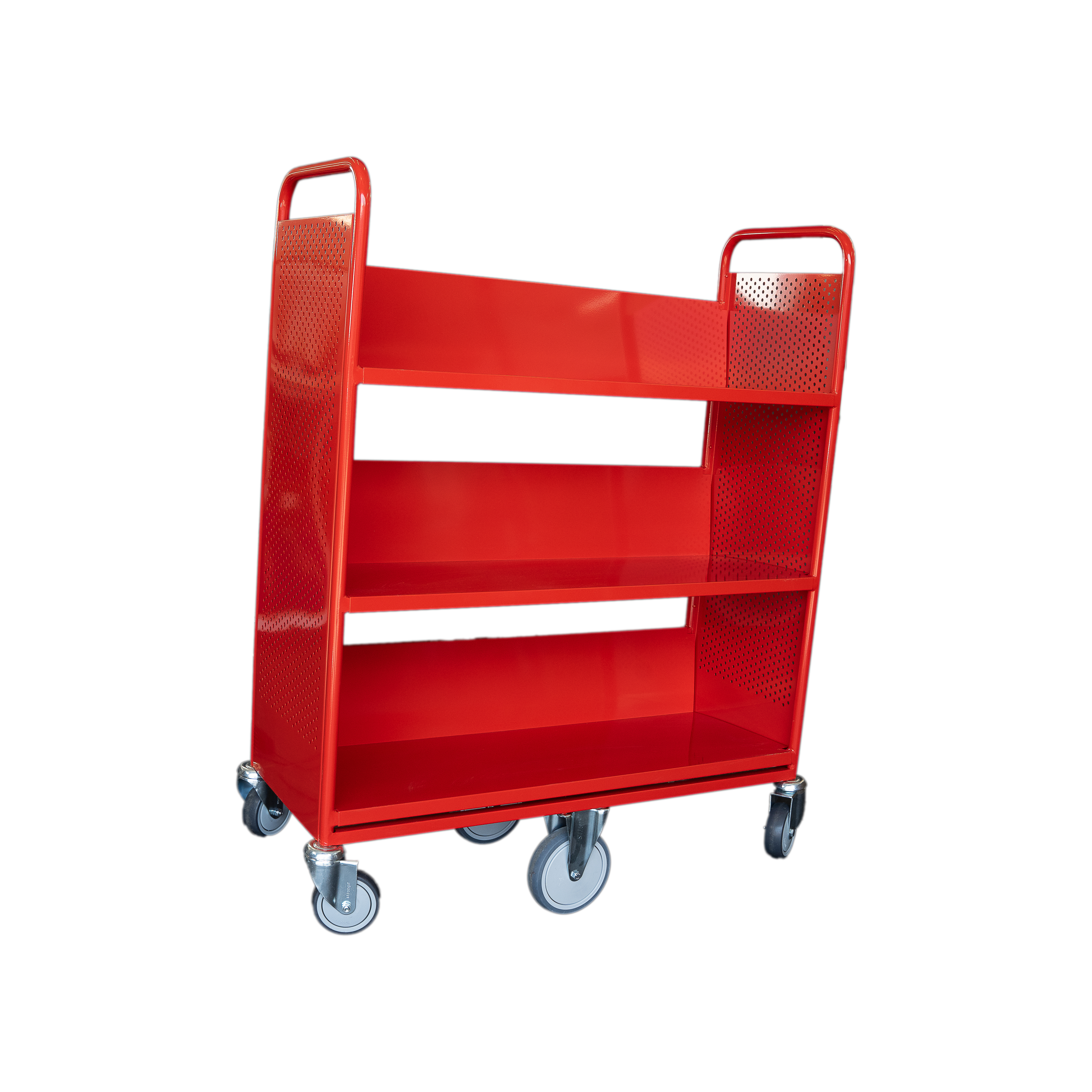 Vozík je v celokovovém provedení, má 3 police nakloněné dozadu, boční designové perforované plechové bočnice, vyniká velkou nosností a snadnou manipulovatelností. Vozík má kromě 4 standardních koleček ještě navíc 2 velká transportní kola, díky kterým snadno překoná i velké nerovnosti jako jsou prahy dveří, přechody mezi podlahami, vozík se navíc otočí na místě o 360º. Výška mezi policemi 293 mm.