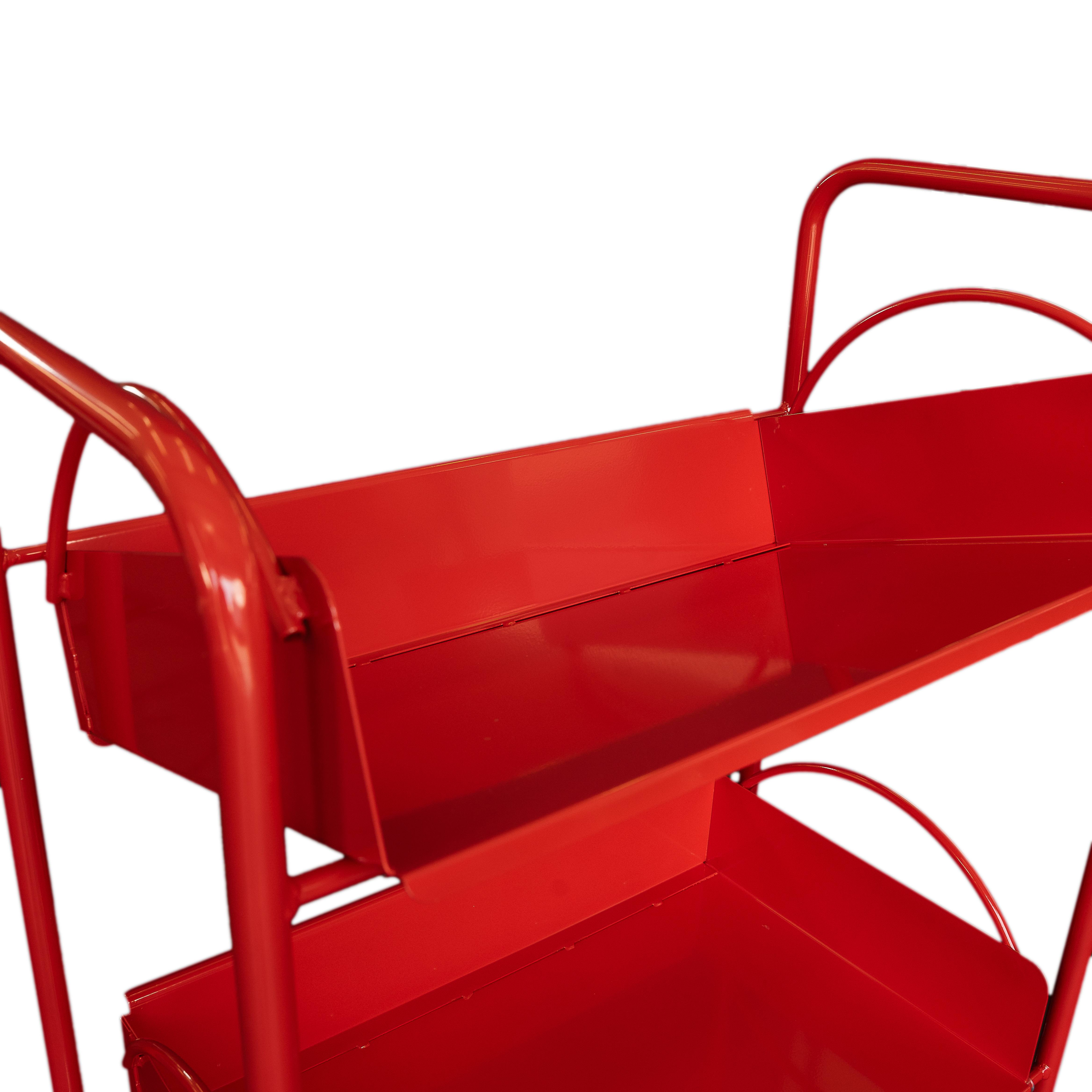 Celokovový vozík se dvěma volně loženými košíky, které lze z vozíku sejmout a použít na odkládání knih.