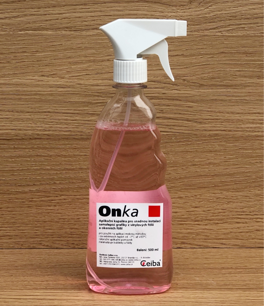Aplikační kapalina pro jednoduchou aplikaci samolepících fólií. Onka aplikační kapalina, byla speciálně vyvinuta pro usnadnění samotné aplikace, aby došlo k požadovanému a dostatečnému kontaktu lepidla s nosičem. Onka eliminuje vzduchové bubliny, zvrásnění a umožňuje manipulaci s předmětem během aplikace. Aplikace je možná i při extrémních teplotách do -7°C.