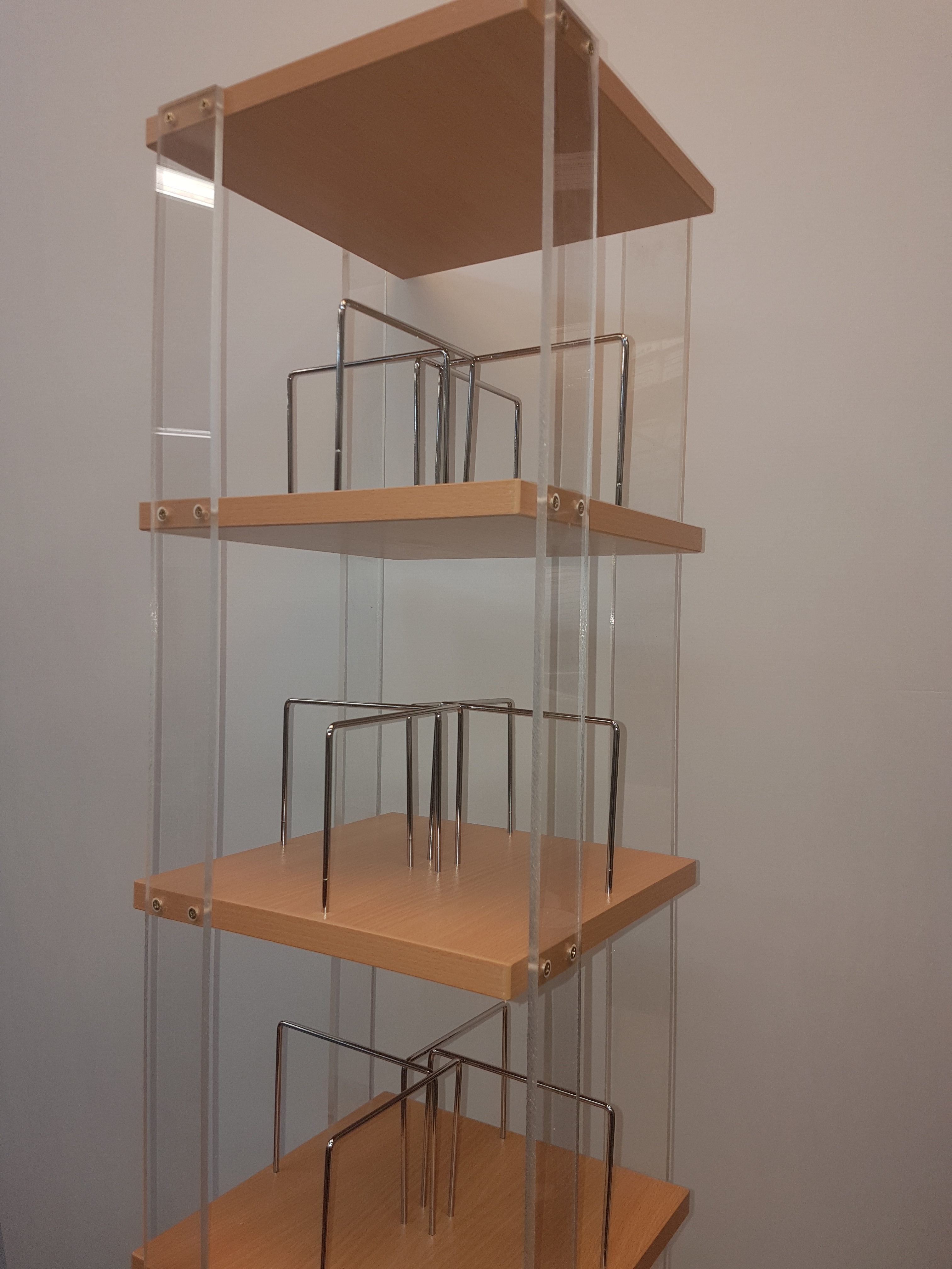Otočný stojan Rotalino, je excelentní systém jak prezentovat paperbacky, video, DVD a CD nosiče, ale také knihy menších formátů. Využít lze také úložný prostor v podstavci stojanu. Vyrobeno z lamino desek a 10 mm silného plexi. Celková výška: 1630 mm, rozměry podstavce: 400 x 400 x 400 mm, kapacita 125 knih. Dodáváme je v rozmontovaném stavu, zvlášť podstavec a zvlášť stojan. Samotná montáž je velmi jednoduchá.