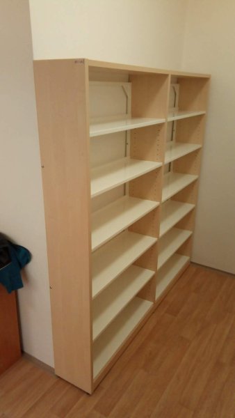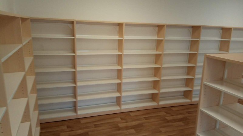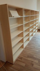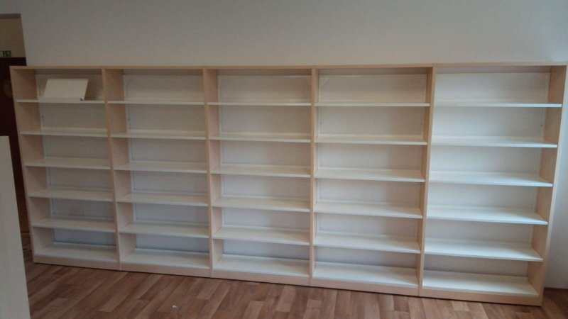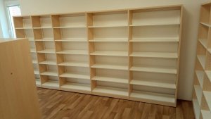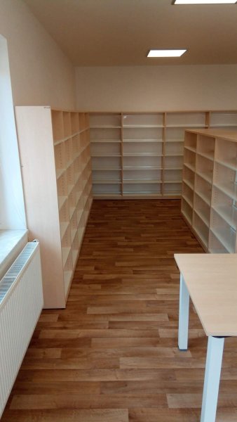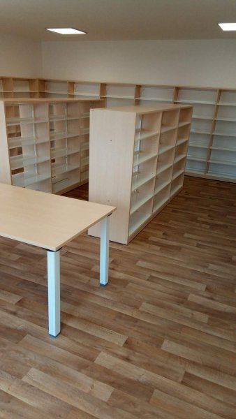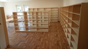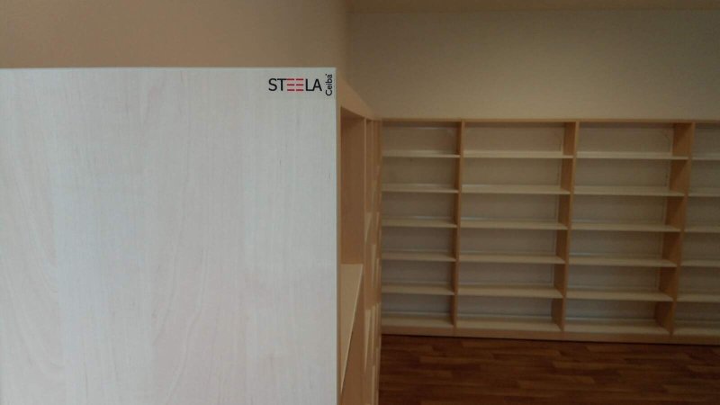 Vybavení knihovny novými regály řady STEELA, PC stoly a stoly se skládacími nohami.