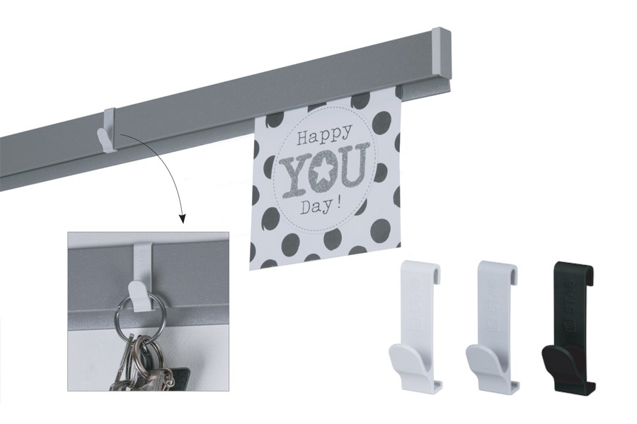 STAS Papergrip lišta na papíry je vhodný jak pro silný tak pro tenký papír a lze do ni upevnit dokonce i tenké časopisy do 3,5 mm. Volné části kolejnice lze spojit a vytvořit tak závěsný systém po celé šíři stěny. Doplňkem STAS Papergrip lišta na papíry je STAS Papergrip háček v barvě bílé, hliníkové a černé. Zaklapněte speciálně navržené STAS papergrip háčky do kolejnice, abyste mohli pověsit malé věci jako klíče nebo například STAS sadu magnetů 2 v 1 na upínač STAS Papergrip.