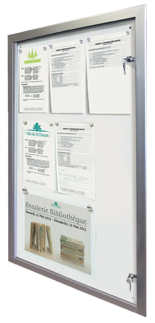 Nástěnná vitrína ECO 100 je vyrobená ze stříbrně eloxovaného hliníkového rámu s šíří profilu 40 mm, tloušťka vitríny je 18 mm. Záda vitríny jsou vyrobená z bíle lakovaného plechu, na který lze upevnit informační letáky pomocí magnetů. Dvířka vitríny jsou vyrobená z 3 mm pevného plexiskla a jsou uzamykatelná na 1 nebo 2 zámky, podle typu vitríny. V nabídce jsou 4 velikosti vitrín.